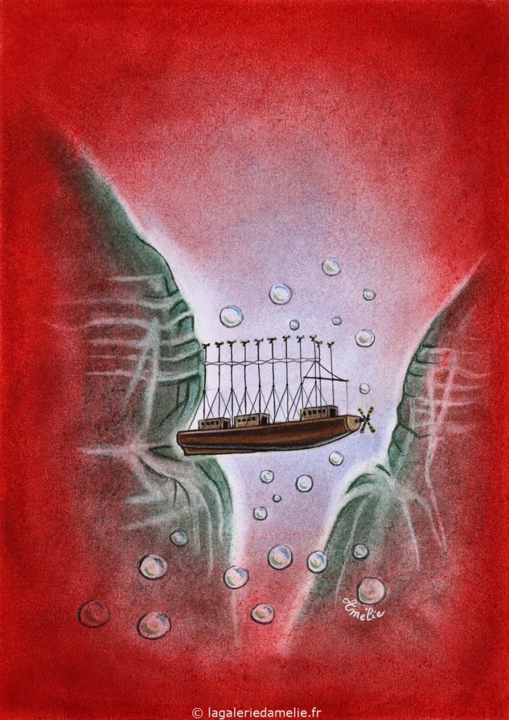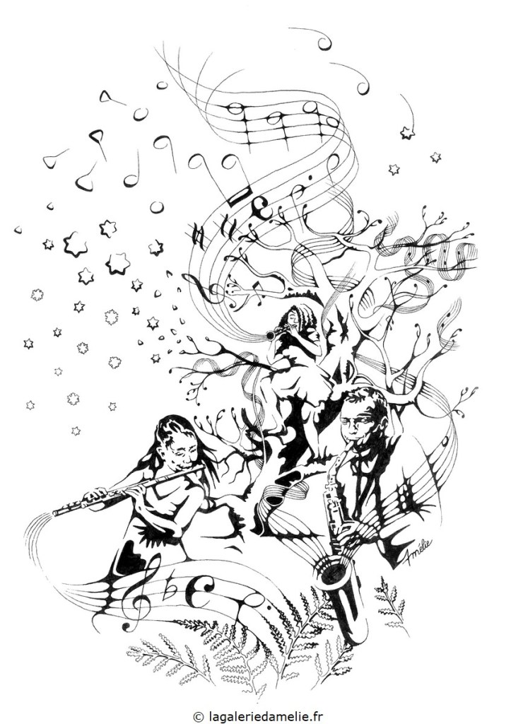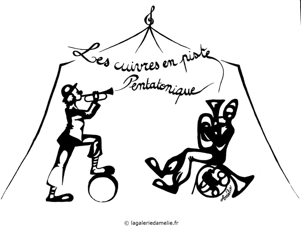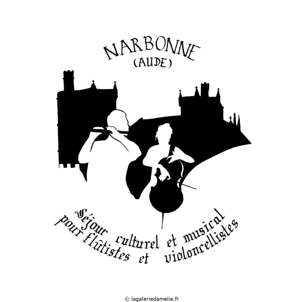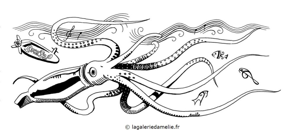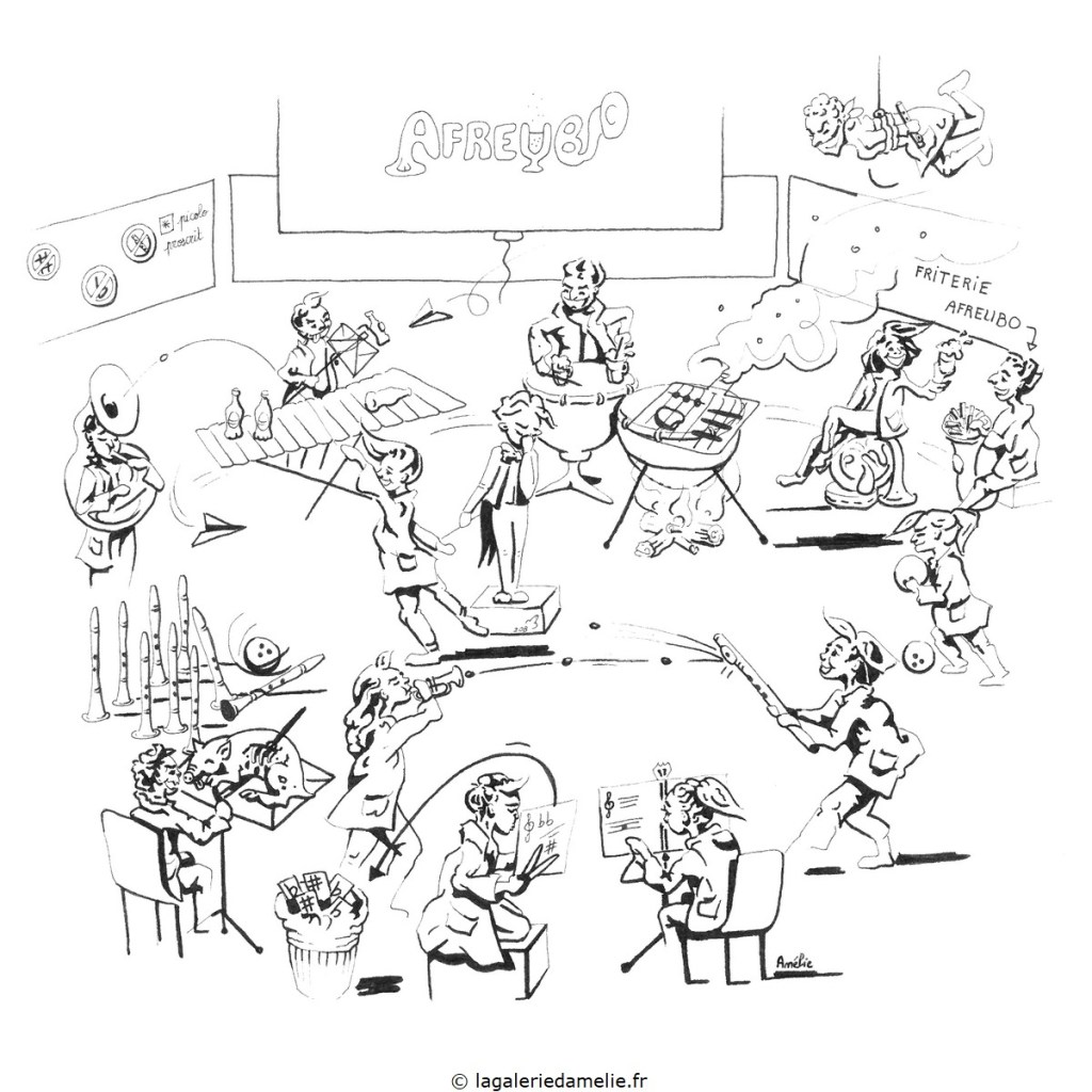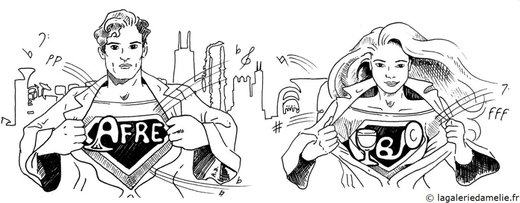 Ci-dessous, dessins pour tote bags et ecocups des « Grands Concerts » annuels de l’association et dessin de l’affiche « L’Afreubo fait le tour de Jules Verne ».