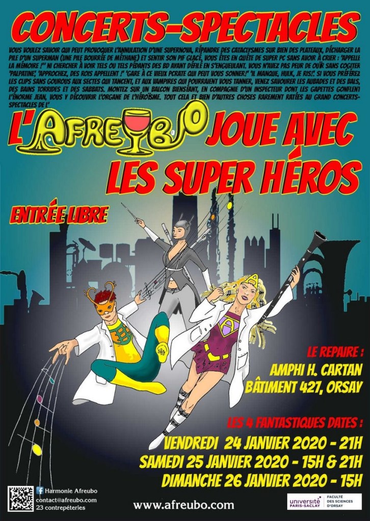 Ci-dessus trois affiches et un flyer pour l’Afreubo (Association (F)ilharmonique des Résidents et Étudiants des Ulis, Bures et Orsay).