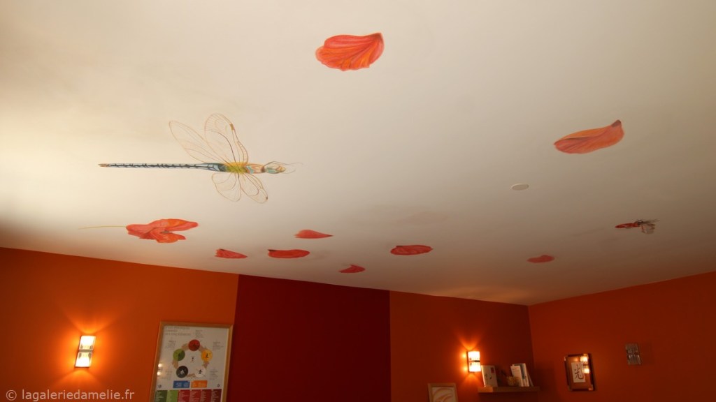 Dessins naturalistes réalisés au pastel sur le plafond d’un cabinet de thérapie.