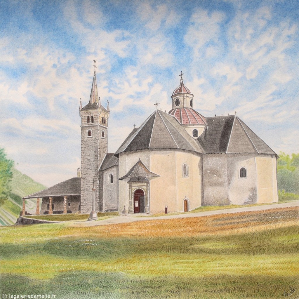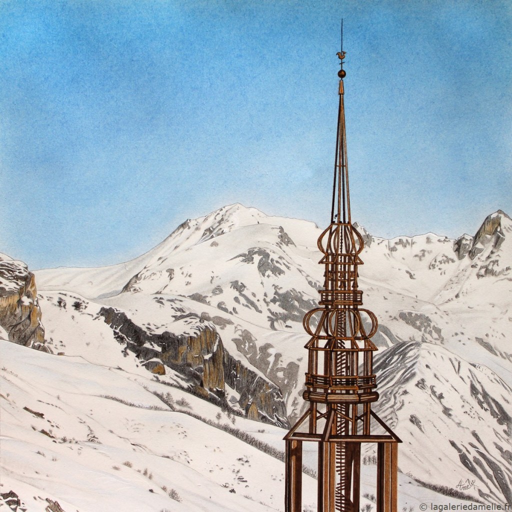 Chapelle Notre-Dame de la Vie et clocher des Menuires | Pastel, fusain, aquacolor, feutre à alcool, Posca et encre acrylique sur format 30 x 30 cm.