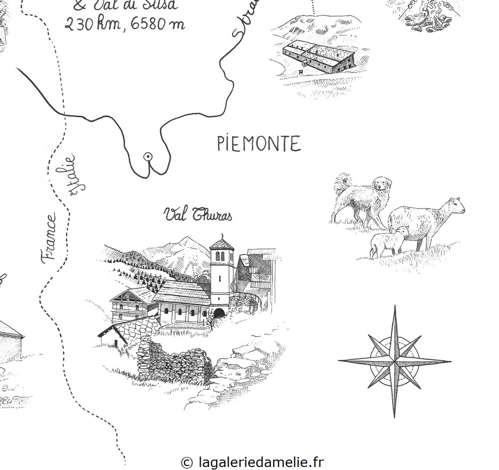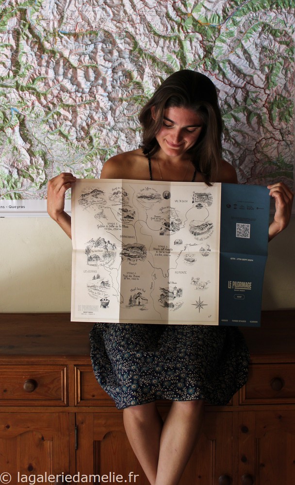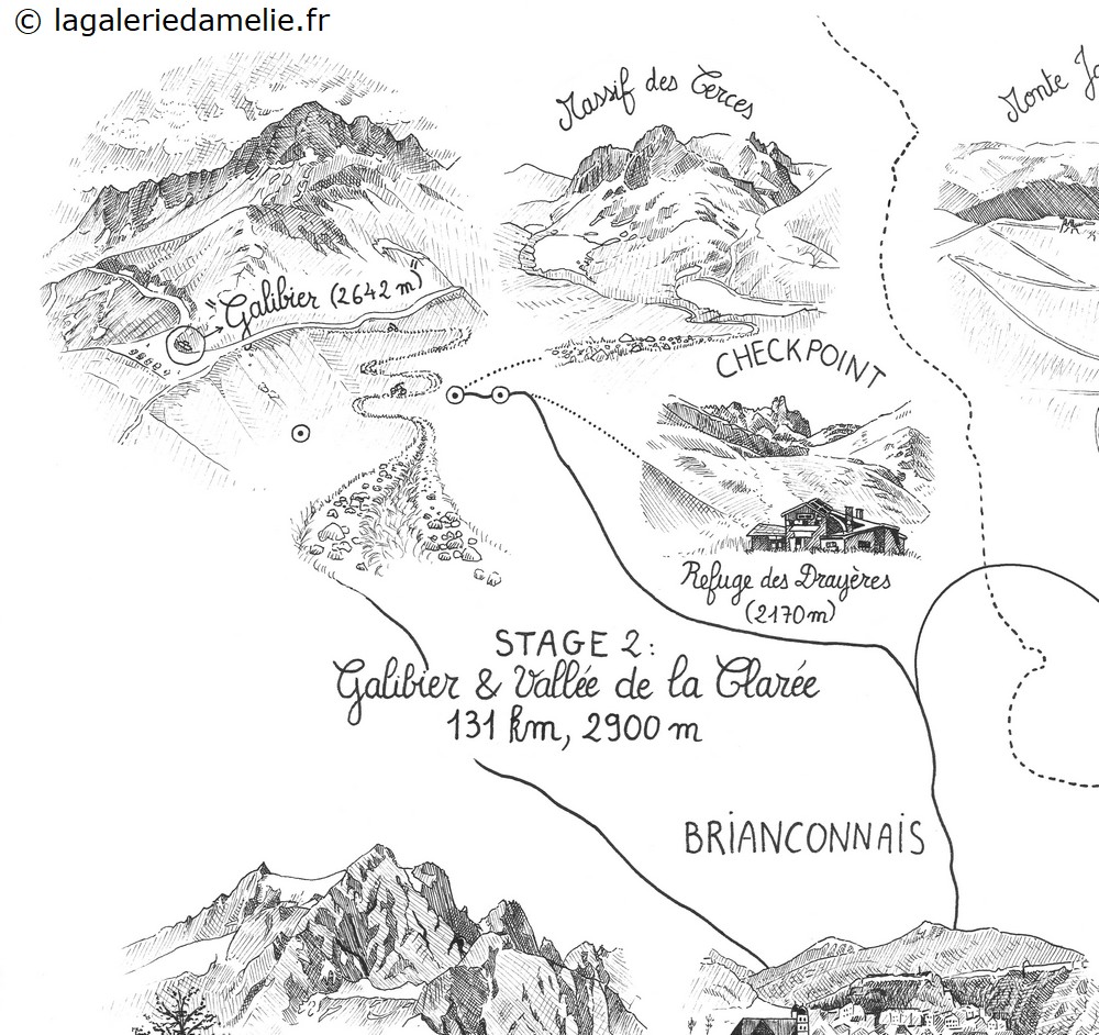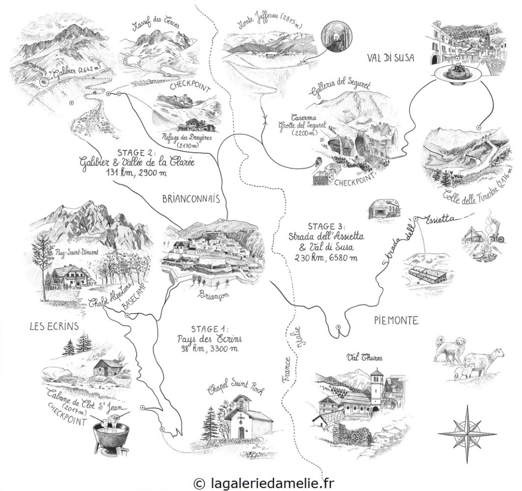 Dessin des différents lieux d’intérêts du « Pilgrimage »: triple circuit de gravel (vélo tout terrain) dans le Briançonnais, organisé par Anne et Simon Rosmolen. Le dessin a été édité en cartes distribuées à chaque participant.