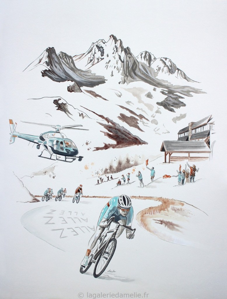 Tableau 2 : passage du Tour de France, hélicoptère dans le ciel, Hôtel Saint Roch sur l’une des montagnes alentours, spectateurs le long de la route, un coureur échappé, le peloton, inscription «ALLEZ ALLEZ ALLEZ » sur la route.