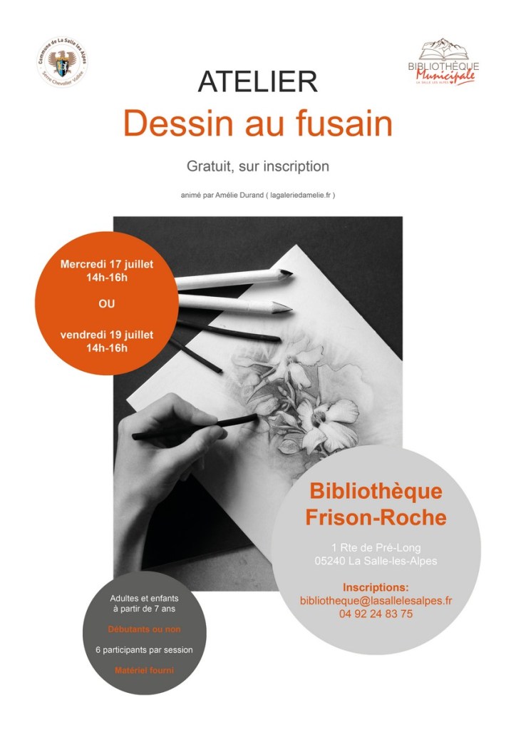 En parallèle de l’exposition, j’animerai des ateliers « dessin au fusain » les 17 et 19 juillet.