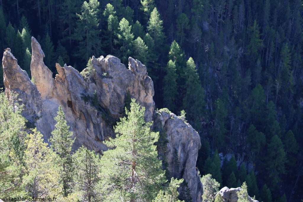 « Demoiselle coiffée » ou « cheminée de fée » issue de l’érosion par l’eau d’une ancienne moraine glacière. Elle est protégée par son sommet plus dur, et renforcée par une eau riche en silice remontant l’édifice par capillarité.