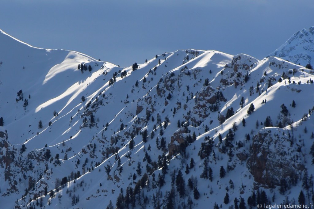 Vue sur le Queyras en montant à l’Infernet en ski de randonnée. Photos prises vers midi, mi-janvier 2023.